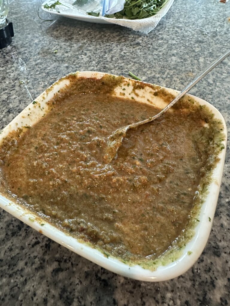 2. Blend garlic, 2 green chillis, tomato, and cilantro. Use little to no water. The consistency should be paste-like, not runny. Add in red chilli powder, paprika, Shan Fish Masala, salt, cumin/coriander powder, and turmeric powder.